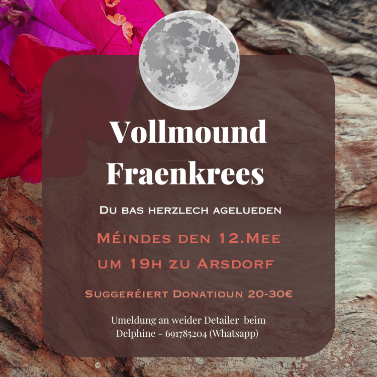 Den Moment fum Neimound as besonnesch geeejent fir eis Opmierksamkeet op daat ze riichten wat mir wëllen an eis d’Liewen ruffen an kraftvoll Intentiounen setzen fir den kommenden Mount. Oft as et och den Zeitpunkt am weiblechen Zyklus wou d’Menstruatioun asetzt, et kann een also nach méi profitéieren fir an sech ran ze lauschteren an besonnesch douce mat sech sinn – wat sech och am Krees wert weisen.